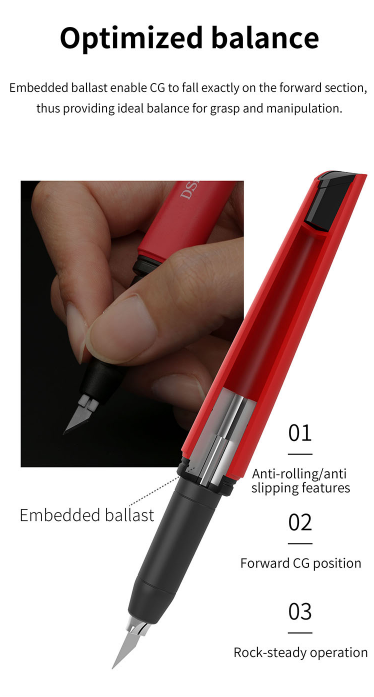 Den lette konstruksjonen i ABS og PC reduserer håndtretthet, mens en selvspennende klemme holder bladet stabilt og hindrer rotasjon for mer presis kontroll.