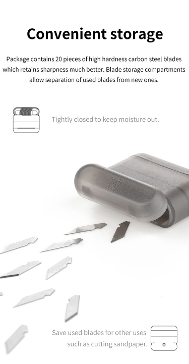 Leveres med 1 knivhåndtak og 20 karbonstålblader, samt bladboks.
