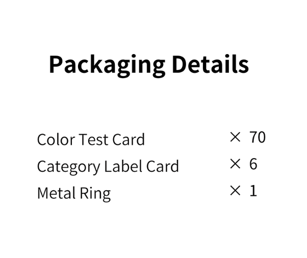 Kortstokken inneholder 70 kort, seks kategorimerkekort og en metallring for enkel oppbevaring og organisering av fargeprøver. På baksiden av hvert kort er det felt hvor du kan notere fargeformel, blandeforhold eller andre relevante detaljer — ideelt for gjentakbar fargematching.
