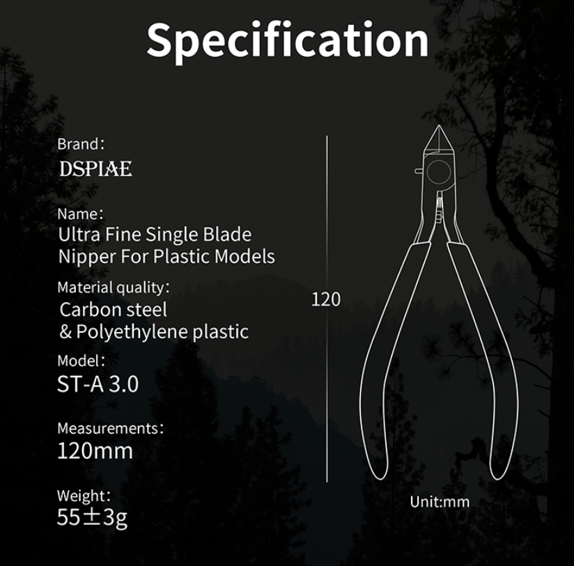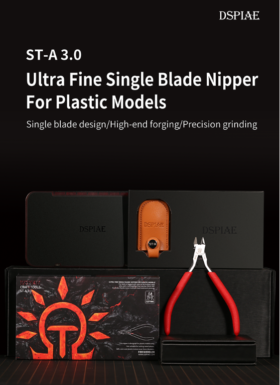 DSPIAE ST-A 3.0 Ultra Fine Single Blade Nipper er et presisjonsverktøy utviklet spesielt for modellbyggere som ønsker ekstremt rene og kontrollerte kutt av plastdeler. Den ultra-tynne enkeltbladdesignen gjør at den skjærer plast spruer og deler med minimal stress og etterbehandling, og gir et pent resultat hver gang. Nipperens blad er smidd i høykvalitets legeringsstål med høy hardhet (HRC 58–64), og det ergonomiske håndtaket gir komfortabel, stabil kontroll under bruk.