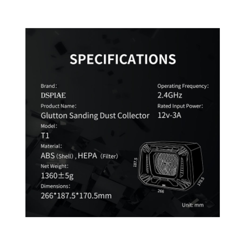 DSPIAE Glutton Sanding Dust Collector er et kraftig og praktisk støvoppsamlingssystem utviklet for modellbyggere og hobbyentusiaster som ønsker et rent og profesjonelt arbeidsmiljø. Utstyrt med en høyeffektiv støv­motor og avtagbar filterkasse, fanger den opp slipestøv, partikler og rester fra bygging uten at arbeidsplassen blir til et rot.