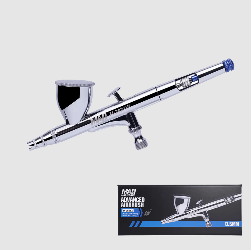 Madworks Advanced Airbrush M-202 EX 0,5 mm er perfekt for modellbyggere, våpenbyggere, miniatyrmalere og hobbyister , og leverer uovertruffen presisjon, holdbarhet og stil.
